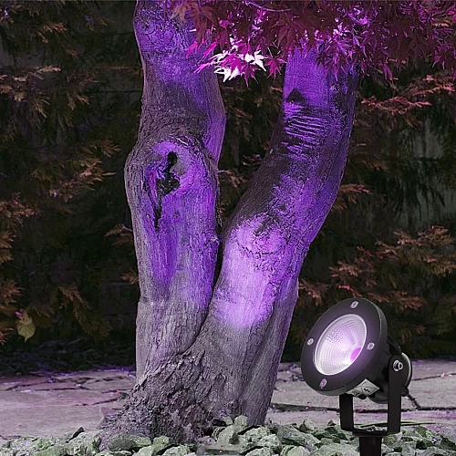 Solar powered garden light, no electricity required, black cover with 7 lighting colors10W Moving Garden Plant Spotlight, Purple Lighting Color